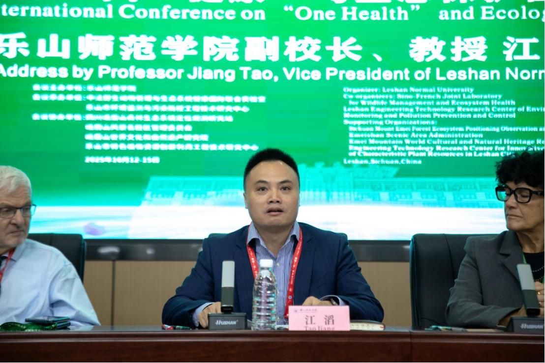 本网讯(文/图 孟繁增/康浩然)10月13-15日,由乐山师范学院主办,乐山师范学院生命科学学院、中法野生动物管理与生态系统健康国际联合实验室、乐山市环境监测与污染防控工程技术研究中心联合承办的“2025年‘同一健康(One health)’与生态保护国际研讨会”在我校举办。海内外60余位专家学者齐聚一堂,围绕“同一健康”理念下的生态保护与可持续发展开展跨学科对话。学校党委常委、副校长江滔教授、法国驻华大使馆科技专员贝海琳女士出席开幕式并致辞。