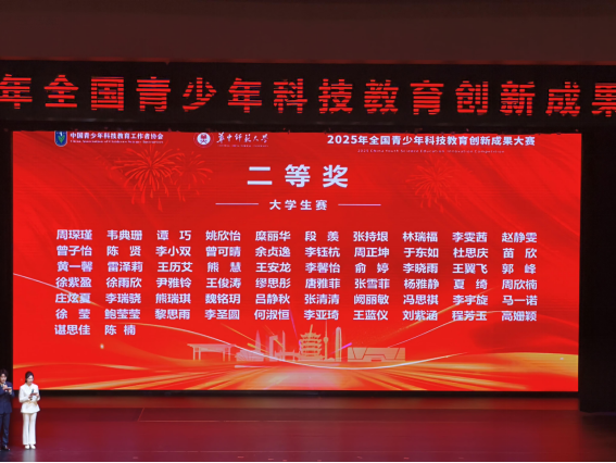 本网讯(文、图/叶超)近日,由中国青少年科技教育工作者协会主办,协会科学教师教育专委会、华中师范大学及《中国科技教育》杂志社承办,中国科技发展基金会、湖北省科学技术协会及格科微电子(上海)有限公司等单位提供资金和技术支持的“2025年全国青少年科技教育创新成果大赛”全国总决赛在华中师范大学落下帷幕。我校生命科学学院学子在王昭君老师、叶超老师及张旭梅老师的指导下,由叶超老师带队,在该总决赛的“大学生赛道”中斩获二等奖2项、三等奖1项。